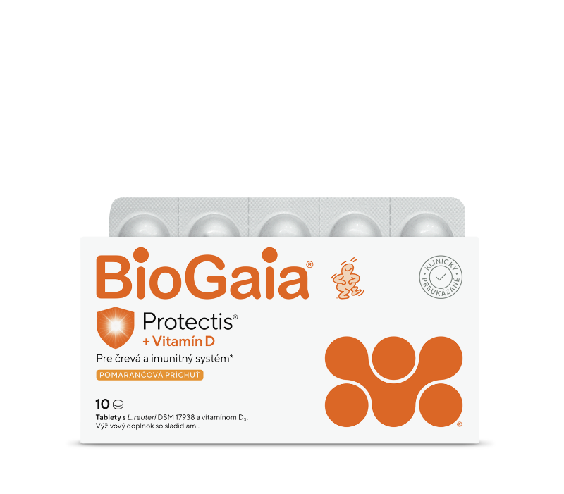 Tablety BioGaia Protectis s vitamínom D sú doplnok stravy, ktorý obsahuje kombináciu baktérií mliečneho kvasenia Limosilactobacillus reuteri (L. reuteri Protectis) a vitamínu D3. Vitamín D je vitamín rozpustný v tukoch a množstvo vitamínu D, ktoré dostávame zo slnka, závisí okrem iného od nášho životného štýlu, veku, farby pleti, ročného obdobia, dennej doby a zemepisnej polohy. Tablety BioGaia s baktériami mliečneho kvasenia a vitamínom D majú pomarančovú príchuť a obsahujú 10 μg vitamínu D3, ako aj živé baktérie L. reuteri Protectis. Dostatočný príjem vitamínu D prispieva k správnemu fungovaniu imunitného systému a podporuje udržanie normálnej funkcie svalov a normálnych kostí.