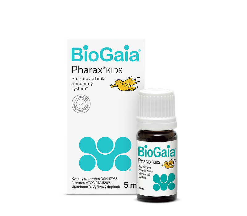 BioGaia Pharax KIDS je výživový doplnok podporujúci prirodzenú rovnováhu mikroflóry ústnej dutiny a hrdla. Obsahuje unikátnu kombináciu dvoch patentovaných kmeňov baktérií mliečneho kvasenia: Limosilactobacillus reuteri ATCC PTA 5289 izolovaný z ústnej dutiny a Limosilactobacillus reuteri DSM 17938 (Protectis) izolovaný z materského mlieka. Obidva kmene baktérií boli testované v klinických štúdiách, ktorými bola preukázaná ich účinnosť a bezpečnosť. BioGaia Pharax KIDS navyše obsahuje vitamín D3, ktorý prispieva k normálnej funkcii imunitného systému. Je vhodný pre deti už od 6 mesiacov, ale aj pre dospelých. Odporúčané dávkovanie: 5 kvapiek dvakrát denne poskytuje odporúčanú dennú dávku 400 miliónov živých baktérií Limosilactobacillus reuteri a 10 μg vitamínu D3 na podporu normálnej funkcie imunitného systému po dobu najmenej 10 dní. K dispozícii je v 5 ml balení.